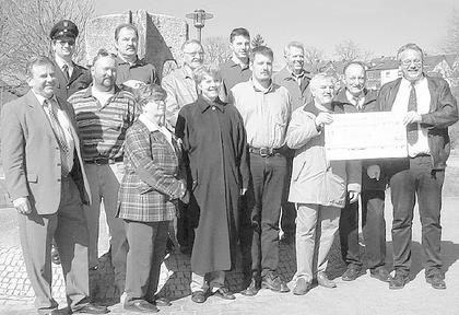 Foto: Peter StarkmannHambach (pst) Einen Beitrag von 1900 Euro leisteten die ortsansässigen Vereine zur Gestaltung des neuen Dorfplatzes. Der Betrag war als Reinerlös beim Brunnenfest im August 2002, Strohgassenfest und Erntefest im September 2002 zusammen gekommen. Erfreut über so viel Gemeinsinn zeigte sich Bürgermeister Michael Herterich (rechts außen), der den Spendenscheck in Empfang nahm. Leider konnten zur Übergabe nicht alle beteiligten Vereine einen Vertreter schicken.